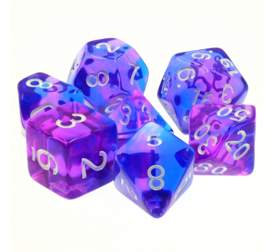 "Stars in a Can" - Purple Blue and Pink Swirl with White Inking - Polyhedral Dice (7) - Level One Dice