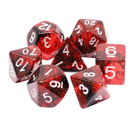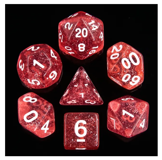 "Raspberry Chew" - Crimson Glitter With White Inking - Polyhedral Dice (7) - Level One Dice