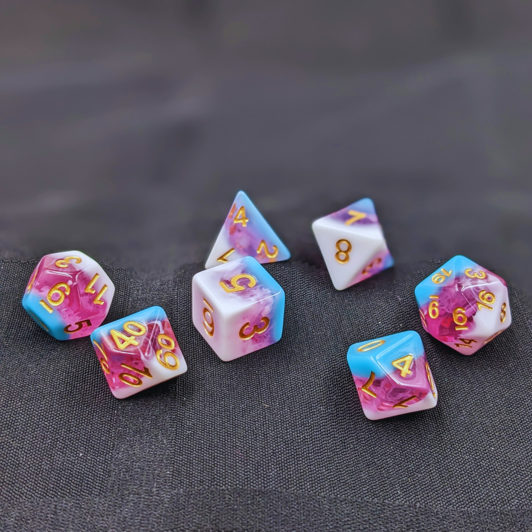 "Dremesavers" Pink/White/Blue with Gold - Polyhedral Dice (7) - Level One Dice