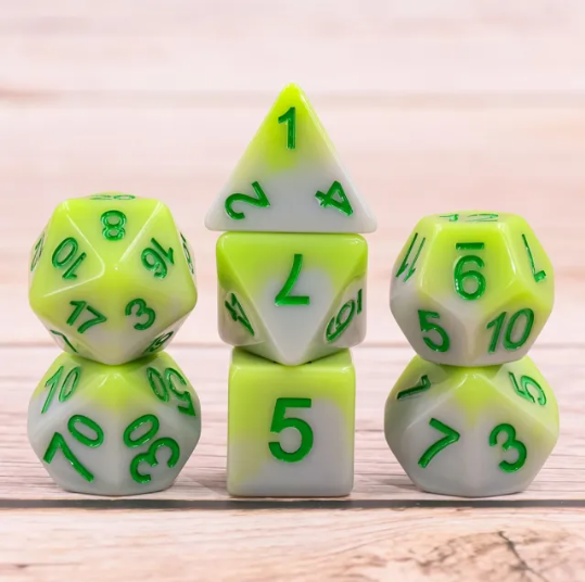 "Cool Cucumber" - Green and Grey Swirl with Green Inking - Polyhedral Dice (7) - Level One Dice