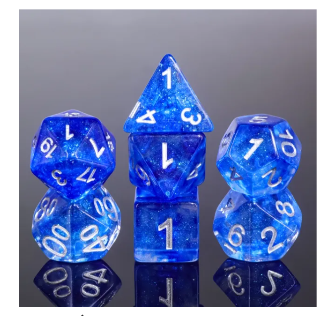 "Cure-All Potion" - Blue Transparent with Glitter and White Inking - Polyhedral Dice (7) - Level One Dice