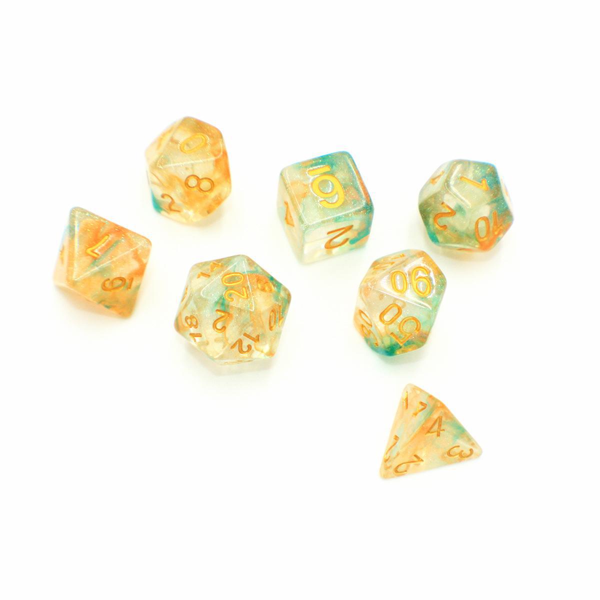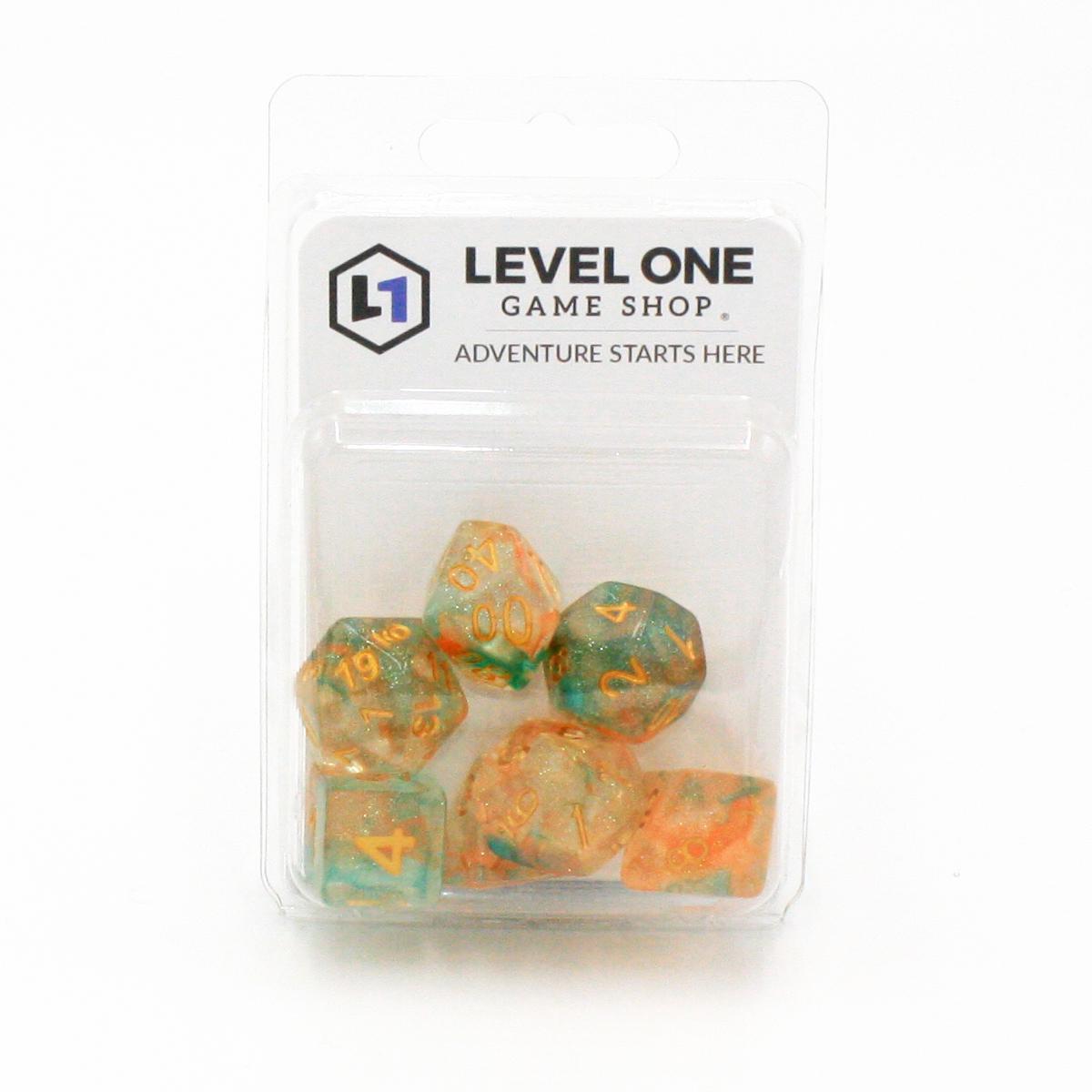 "Cantaloupe Cantrip" - Green and Orange Sparkle Swirl - Polyhedral Dice (7) - Level One Dice