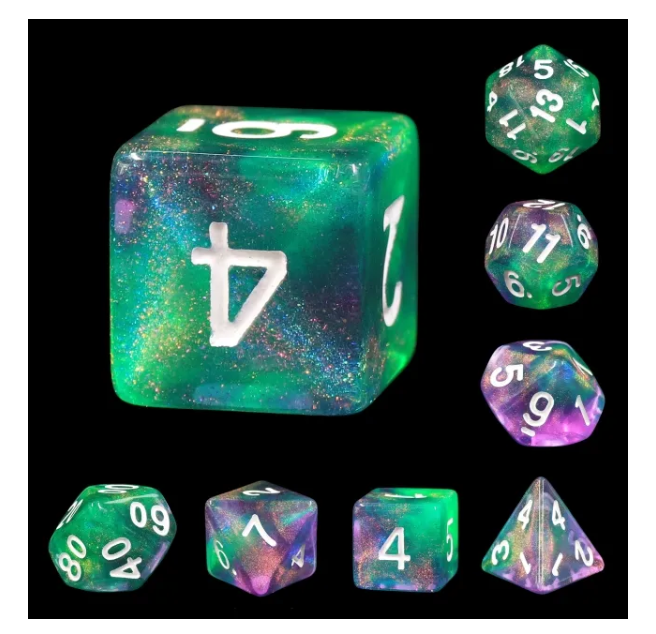"Portent Potion" - Green and Pink Glitter with White Inking - Polyhedral Dice (7) - Level One Dice