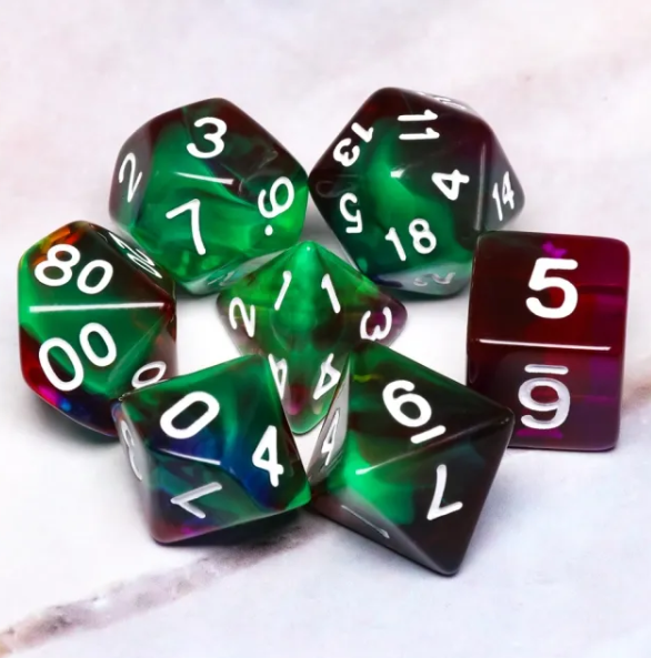 "Potion of Vigor" - Red, Blue, & Green Swirl with White Inking - Polyhedral Set (7) - Level One Dice