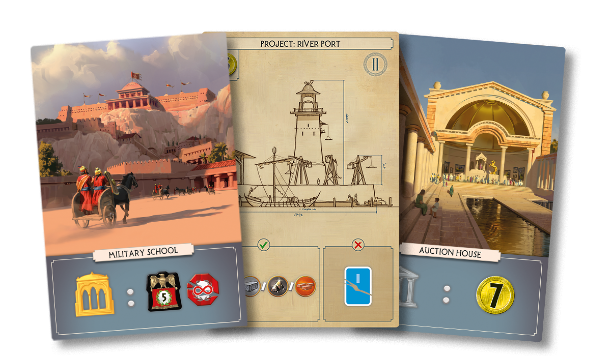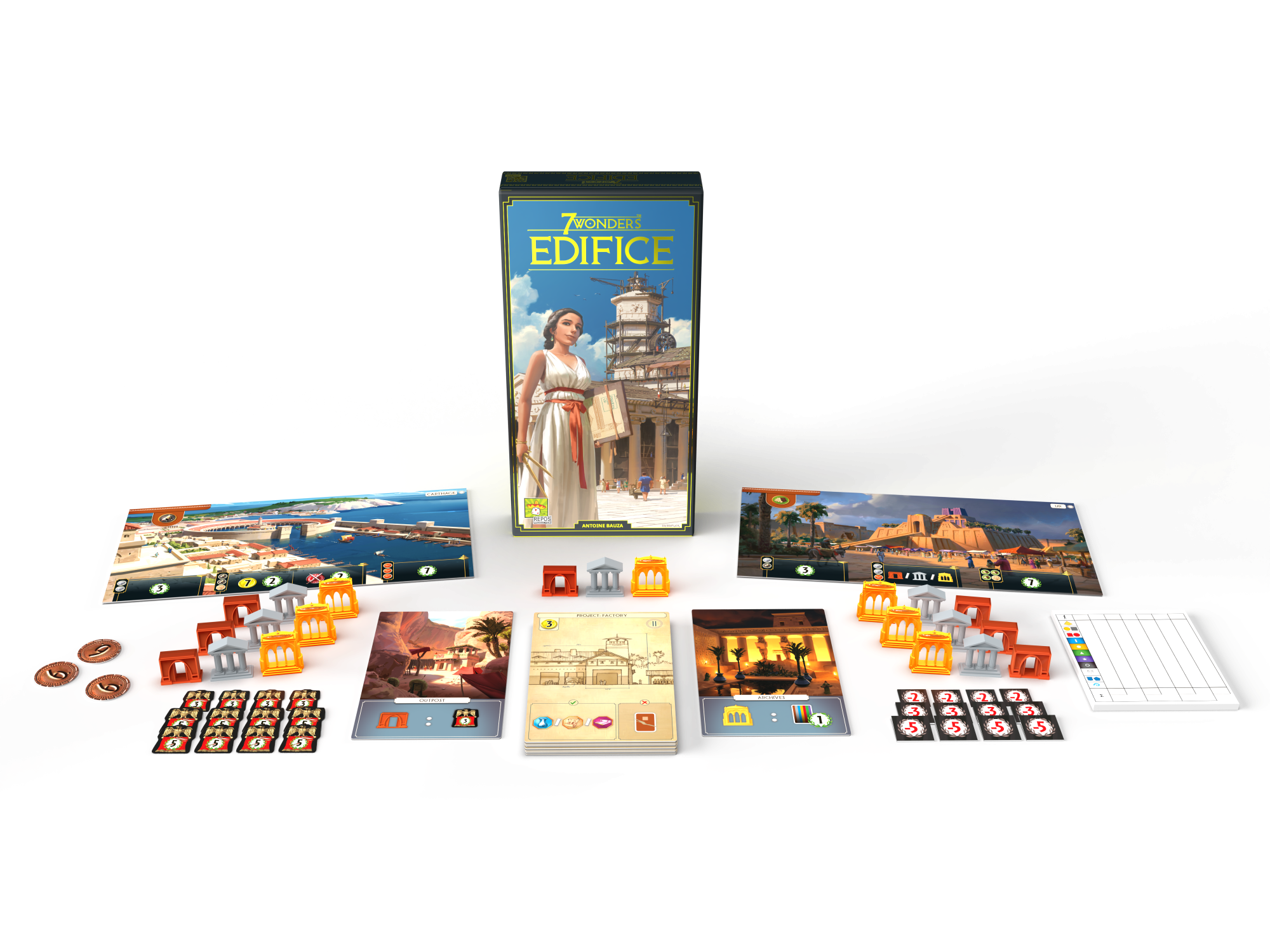 Participate in communal projects to reap the benefits, or suffer the consequences of failed projects. In addition to two brand new Wonders, this expansion introduces a new type of card: Edifices. Amphitheater, Belvedere, Archives, and much more will bring new challenges to your games.