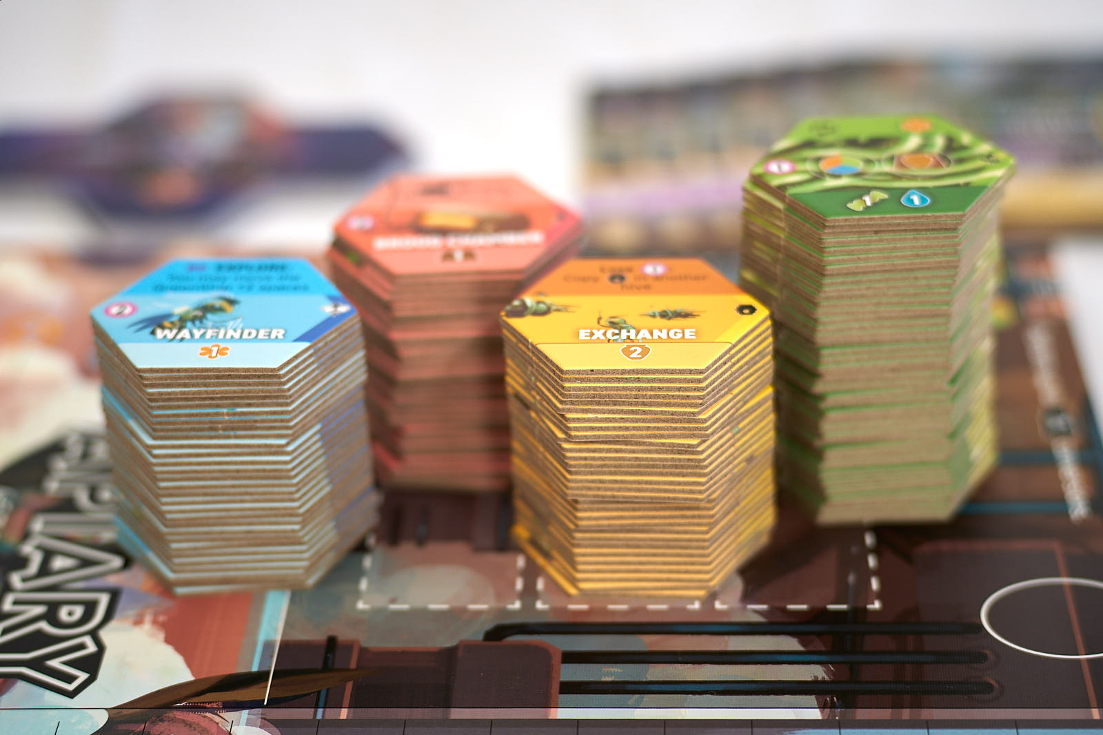 In Apiary, each player controls 1 of 20 unique factions. Your faction starts the game with a hive, a few resources, and worker bees. A worker-placement, hivebuilding challenge awaits you: explore planets, gather resources, develop technologies, and create carvings to demonstrate your faction’s strengths (measured in victory points) over one year’s Flow. However, the Dearth quickly approaches, and your workers can only take a few actions before they must hibernate! Can you thrive or merely survive?
