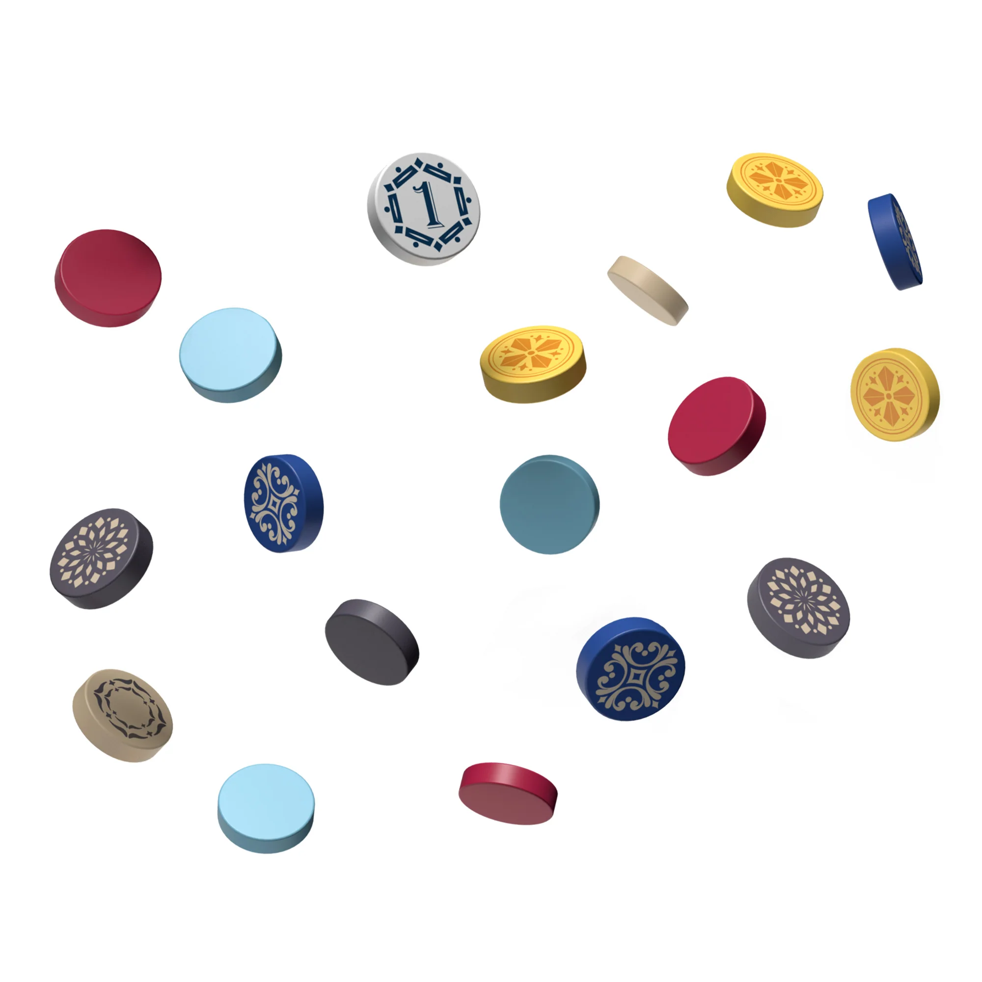 2 Player Boards, 4 Player Tokens, 4 Scoring Markers, 75 Acrylic Tiles, 20 Bonus Chips, 1 Scoreboard, 5 Factories, 18 Dome-Plates, 4 Scoring Tablets, 1 Bag, 1 Tower