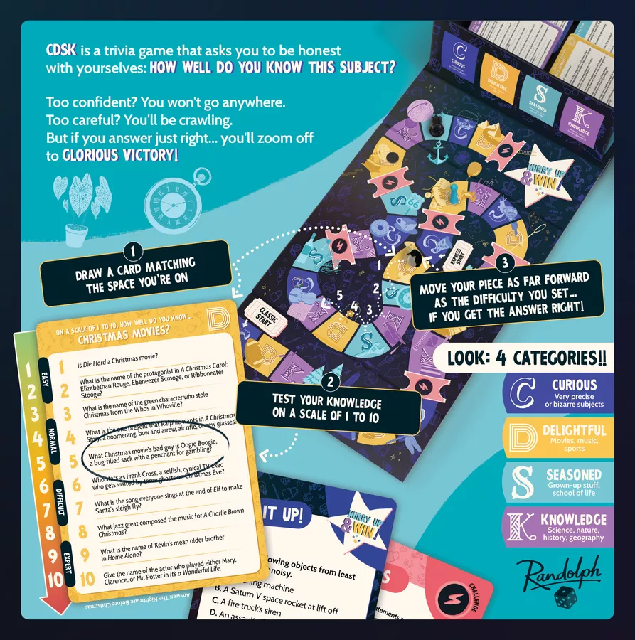 DSK is a trivia game that asks you to be honest with yourselves. How well do you know this subject? Too confident? You won’t go anywhere. Too careful? You’ll be crawling. But if you answer just right… you’ll zoom off to glorious victory!