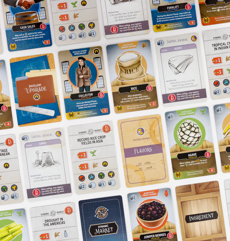 Includes 32 Upgraded Premium Ingredient cards, 12 Dynamic Market cards, 4 Distillery Upgrade cards, 4 Flavor Cards, 3 Cask Strength Rules cards