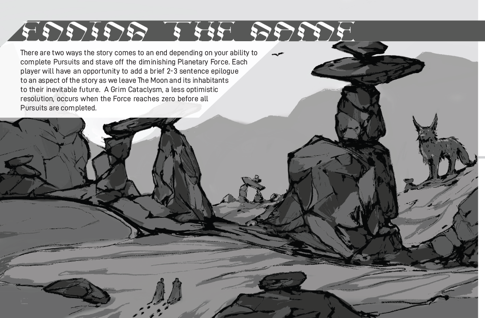 Play is focused on creativity, collaboration, interpretation, and improvisation, allowing every player unique opportunities to shape the direction of their shared story at every stage while juggling randomized lunar challenges and the impending demise of their home world.