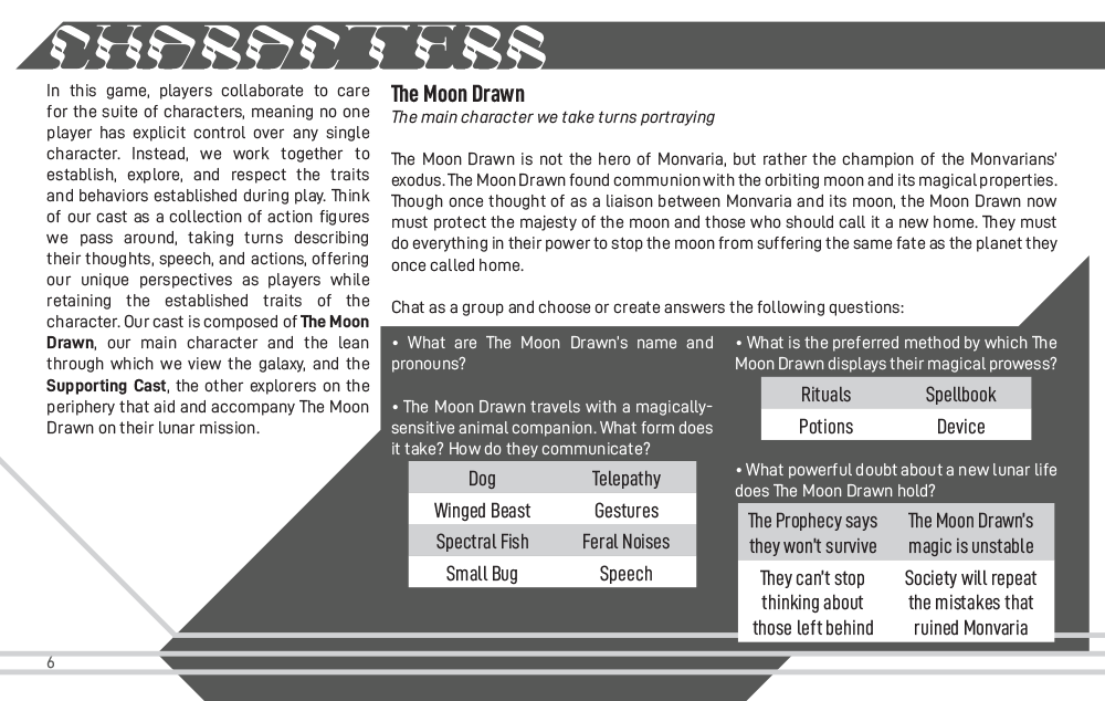 Draw Down The Moon is a storytelling game for 2-6 players. Players embody unique & magical characters escaping their dying planet and pursuing a new life on a mystical and hazardous moon while simultaneously exploring the memories of the things they left behind and the impact those losses have on their hopeful future.