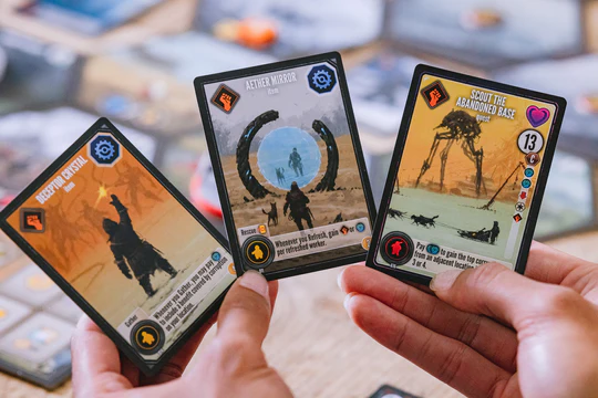 Expeditions is a competitive, card-driven, engine-building game of exploration. It is designed to evoke similar feelings to Scythe even though the mechanisms are different: Play cards to gain power, guile, and unique worker abilities; move your mech to mysterious locations and gain cards found among the tiles; use workers, items, meteorites, and quests to enhance your mech; and use power and guile to vanquish corruption.