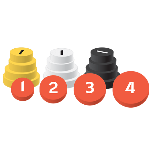 Each player starts the game with a random start-up card, the resources depicted at the top of that card, and four colored discs valued 1-4.