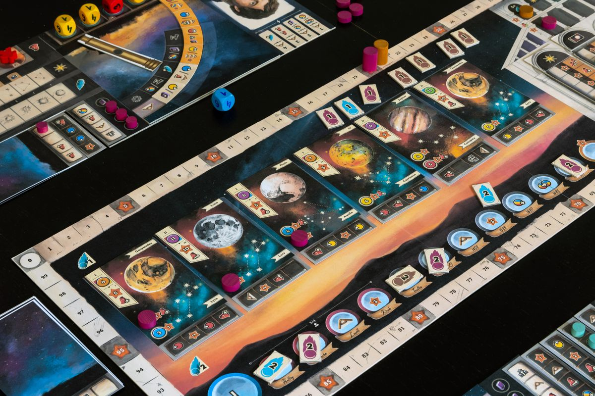 Use your telescope to select one of five available actions where you will be able to evolve these actions into better ones. Discover different planets and star systems. Collect lenses of the three main colors to make a discovery. Be wary of Inquisitors as they might arrive unwelcome and attempt to quickly ruin your fame. Best find a way to profit from their visit instead...