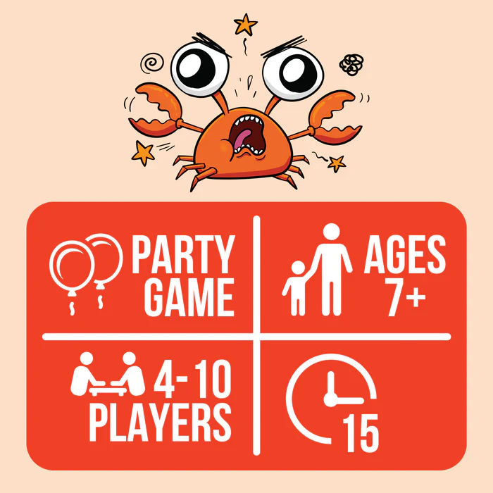 Part sneaky, part silly, and all about teamwork!The object of this game is to collect 4 matching cards and then secretly signal that news to your teammate. These signals can be anything from blinking to a strategic nose scratch. When your teammate sees it, they shout 'Youre a Little Crabby!' If the opposing team catches you and shouts before your teammate, the point is theirs.Its loud, its rowdy, and its a riotous party starter that gets everyone involved and laughing.Great for families, friends, and even or odd-numbered groups.
