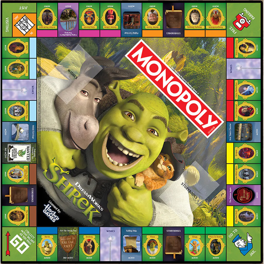Dive into the enchanting world of ogres, fairy tales, and adventure with MONOPOLY: Shrek Edition! Buy, sell, and trade iconic Fairy Tale Characters like Shrek, Donkey, Fiona, Puss in Boots, Gingy, and Dragon. Featuring 6 custom sculpted tokens Magic Mirror, Waffles, Beware Ogre Sign, the Outhouse, an Onion, and Crown! Experience whimsical twists with Community Chest and Chance cards that may lead you to a magical adventure or a bit of mischief. Gather your friends and show them whose the fairest of them all! Enjoy vibrant artwork and special game pieces in this delightful edition inspired by your favorite characters. Join Shrek and his friends for a game filled with laughter and surprises! USAopoly products must be sold in your brick mortar store, or through a website you own. USAopoly products cannot be sold on Amazon, or any other third party website.