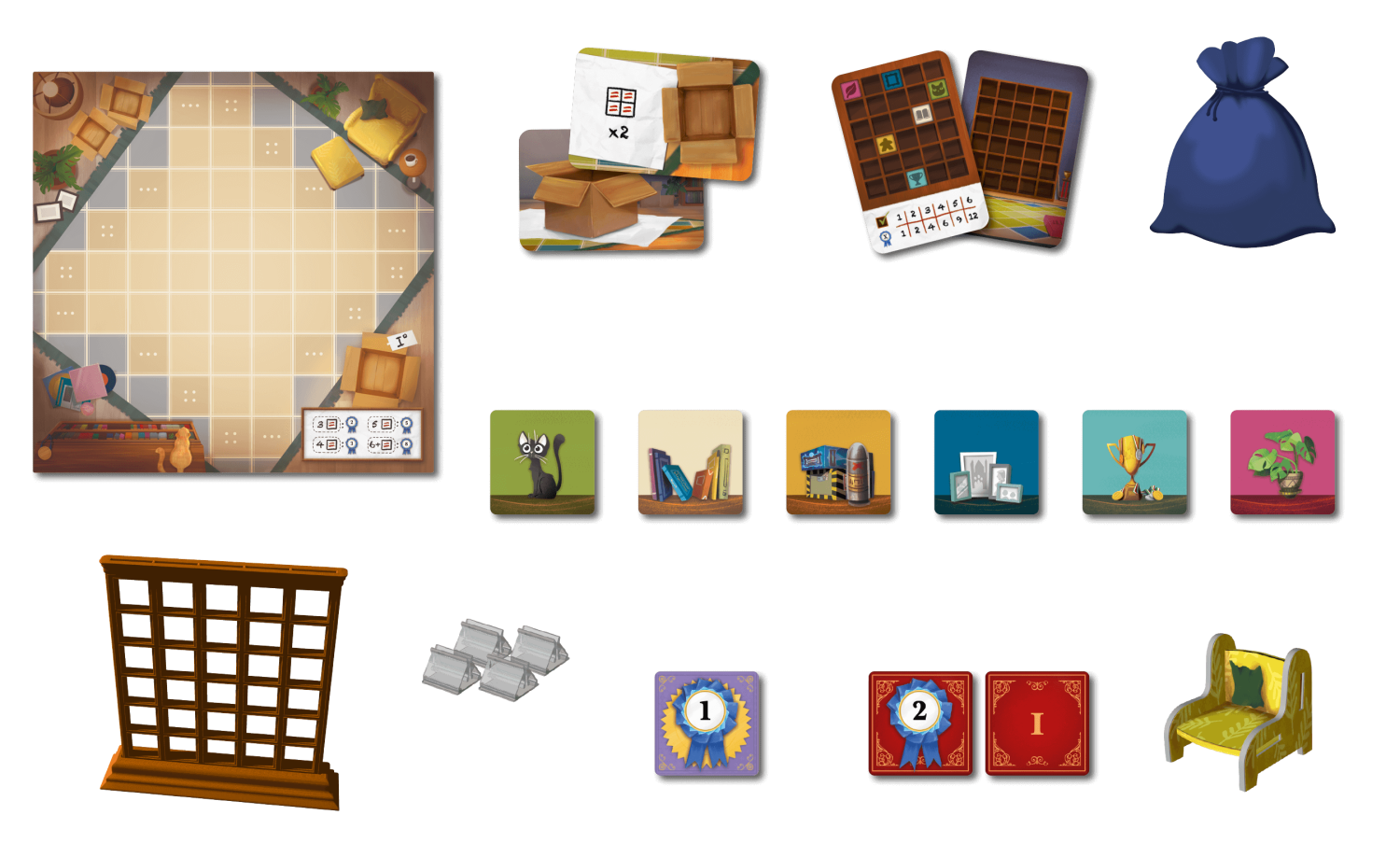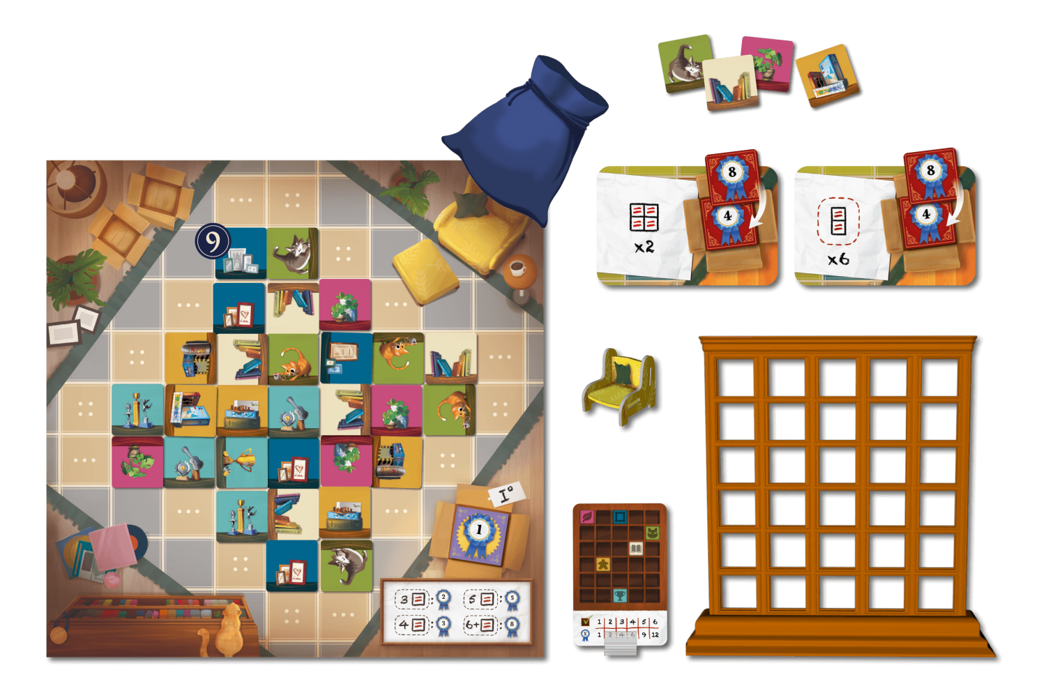 My Shelfie is a strategy game where players are competing to gather the items they need to complete both personal and shared goal cards. When items are gathered, they are placed into one column of the 3D bookshelf display. Players earn points by matching the patterns illustrated on the goal cards, as well as by connecting item tiles of the same type.