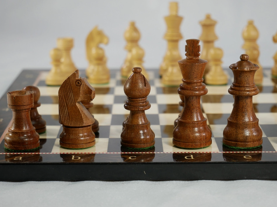 Sheesham/boxwood german knight chessmen with 3” king. Single weighted and felted. Chess pieces on 15" decoupage alpha numeric wood chess board.