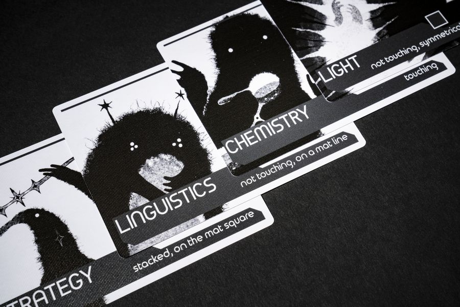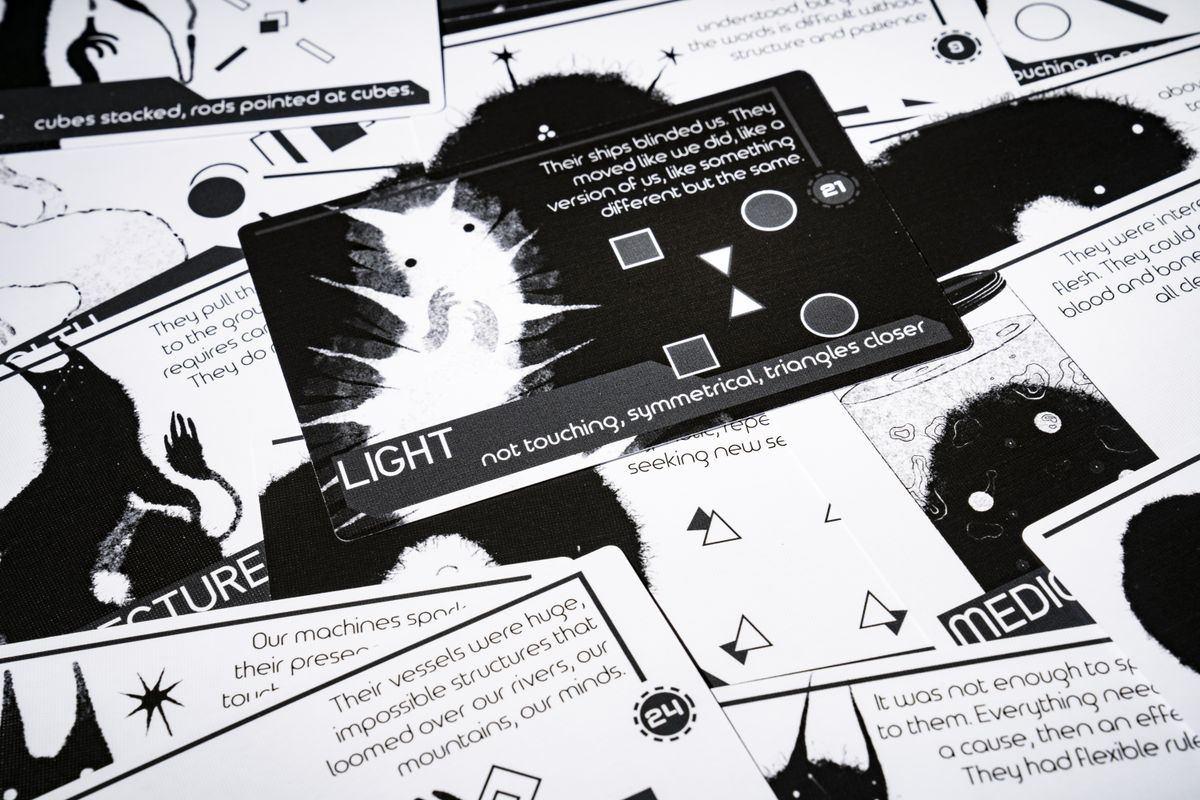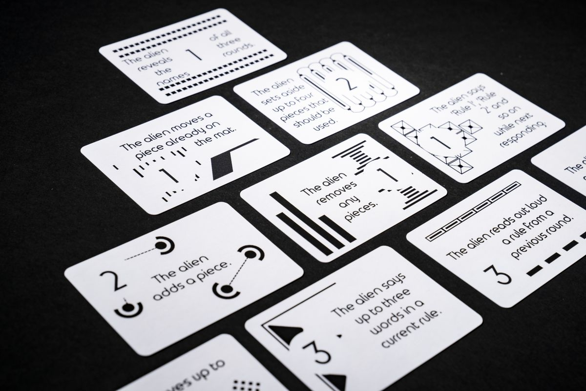 Players take on the roles of Experts seeking to understand the Alien player, who is seeking to be understood. The Experts will create and transmit signals to the Alien, who has certain rules for how to respond that must be deduced by the Experts. On a turn, the Experts arrange black and white pieces on a mat, discussing and debating how and what to send. Once finished, the Alien then replies by using pre-set rules only they can see to add, remove, and adjust the signal. The Experts try to guess the pre-set rules to win cooperatively with the Alien. After succeeding at the first round, Experts then reset and continue with the same Alien, except new rules are in play on top of the previous ones. Players must work through three rounds to solve an Alien, and complete this challenge of communication and logic.