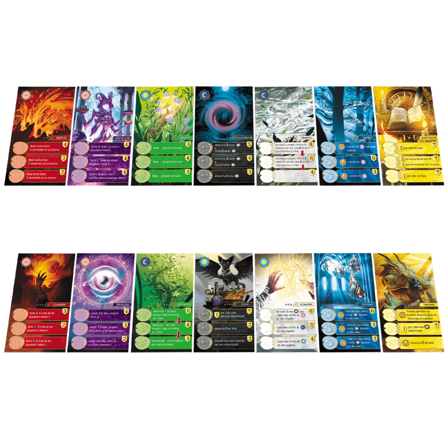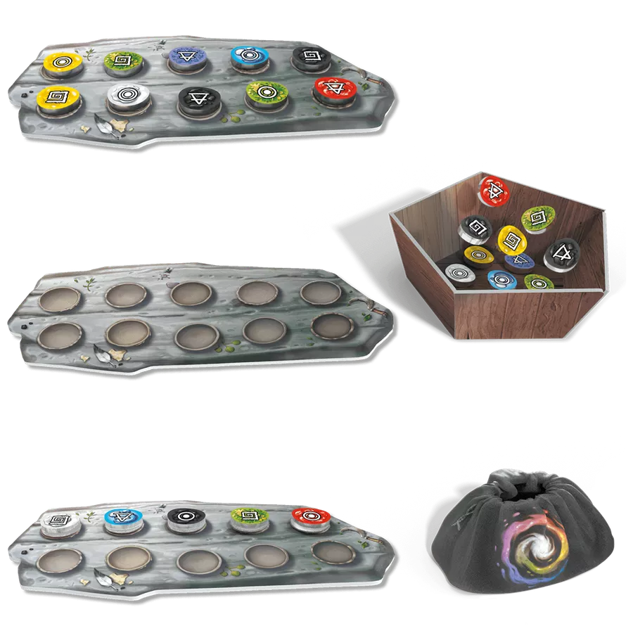 Players take on the role of wizards, gathering to participate in the Annual Grand Rite. During this competition, they work to fill their Spellbooks with new Spells. The wizards gather around a Vortex (represented by the Pouch), which emits various magical components known as Materia, some of which are placed on the Altar. The wizards use this Materia to learn new Spells or store the power within their Familiars, both of which will earn them points. The contest ends as soon as any wizard’s Spellbook or Familiar is filled. The wizard with the most points wins the competition.