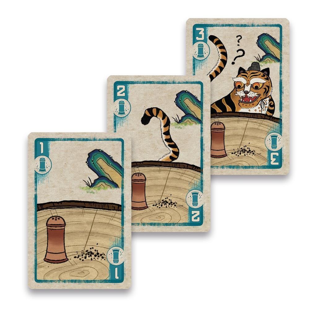 Once upon a time, 3 big cats became exhausted fighting to be top cat. They agreed to quit the fight and spice up their 9 lives with a hot spice eating contest! Alas, soon, everyone was cheating, so the cats invented a very hot, often tearful, bluffing game.Spicy is a bluffing card game for 2-6 players. The cards are played facedown, so players can cheat when they announce their card. But this card game isn't just about bluffing. Players can almost always play a card that is at least half right if they cleverly play their hand.