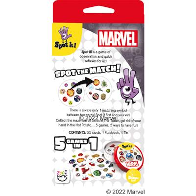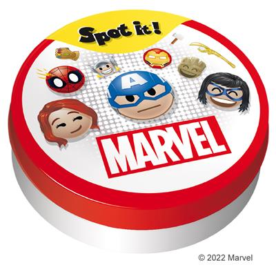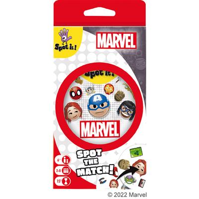 This new version of Spot It! combines different characters from Marvel comics with one of the most emblematic family games. Players try to spot the single matching symbol between two cards in a playful battle of speedy observation. Featuring some of the most iconic Marvel Super Heroes: Iron Man, Captain America, Black Widow, and many more!