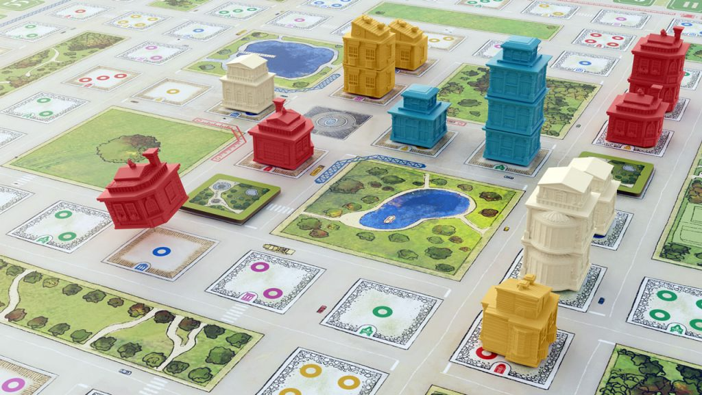 In Sunrise Lane, players take on the role of construction companies attempting to build up a residential neighborhood, and to do this, they need to pick prestigious plots of land on which to build houses and town structures.