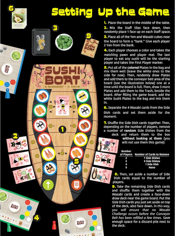 - Easy to Teach & Learn — Sushi Boat is easy (and fun!) to learn, even for younger gamers, but can prove challenging enough to keep gamers of all ages coming back for another serving.