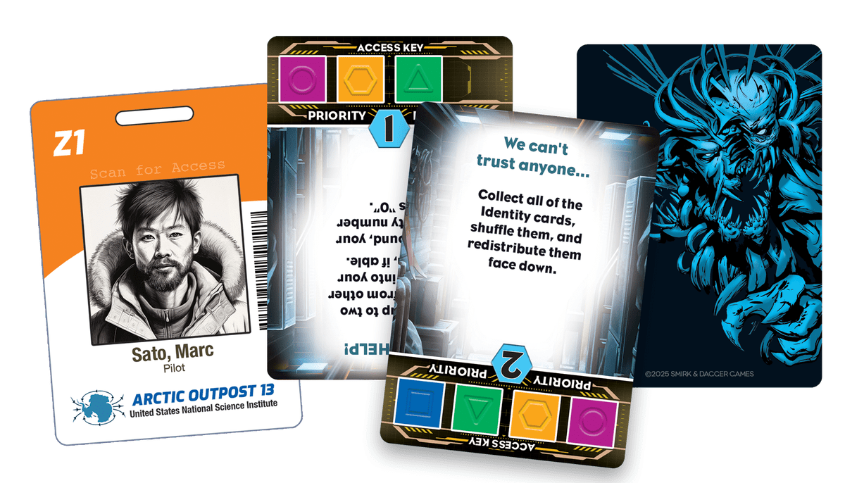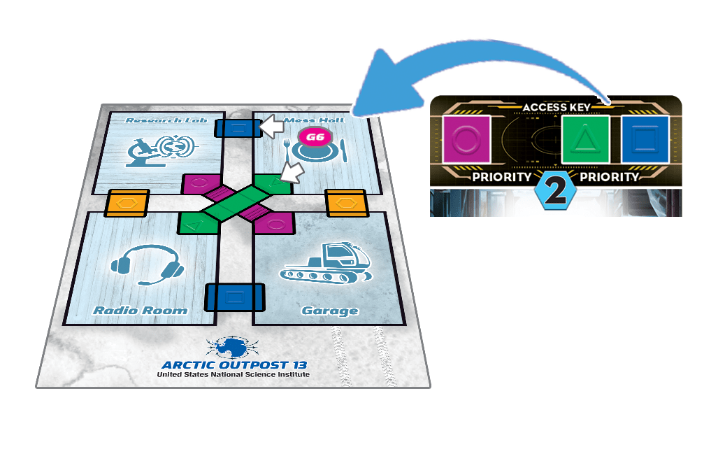 In a round, you will be dealt two cards. Each can be played as either as your movement through a color-coded access passage or as an Action (what you do). On a turn, you play one card, then after everyone has finished, play reverses and comes back around, with you playing the second card for whatever you didn't choose the first time. Thus, you always have one movement and one action.