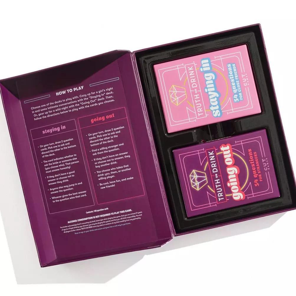 Based on the hit video series, the Truth or Drink games are the card games of honesty and hydration, and this Truth or Drink: Bachelorette Party Edition game offers a bridal spin! It comes with 2 decks to choose from: one for staying in and one for going out. Get the bride and her friends together for intimate conversations or gear up for a legendary night out and meet new friends. Either way, no topic is off-limits, and there’s nowhere to hide. Say “I do” to spilling truth or take a sip! This card game is sure to make some memorable stories. Play it as a stand-alone game or as an expansion to any other Truth or Drink game. Cut games are hysterical adult party games for game night, and NSFW games and adult travel games make cool gifts for adults ages 21+.