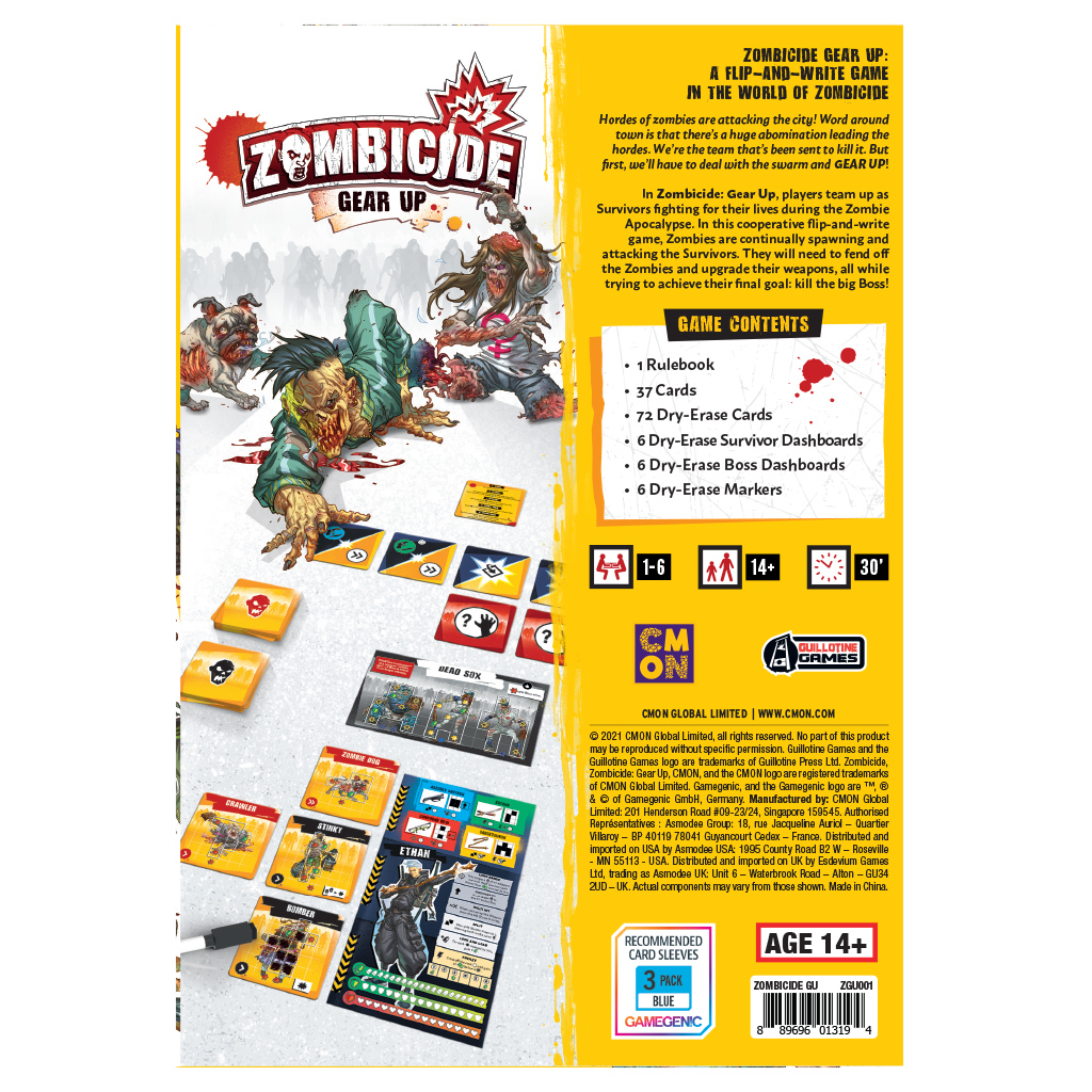 Zombicide: Gear Up is a cooperative flip-and-write game where 1 to 6 players take on the role of Survivors fighting for their lives during the zombie apocalypse. The Survivors are an elite of combatants that have taken to the streets overrun with the undead. There, they must fend off the hordes of Zombies that spawn and move toward them until the Boss appears. This is when the Survivors must achieve their final goal: Kill the Boss and end this zombie invasion!