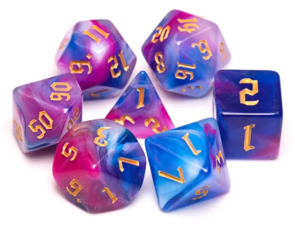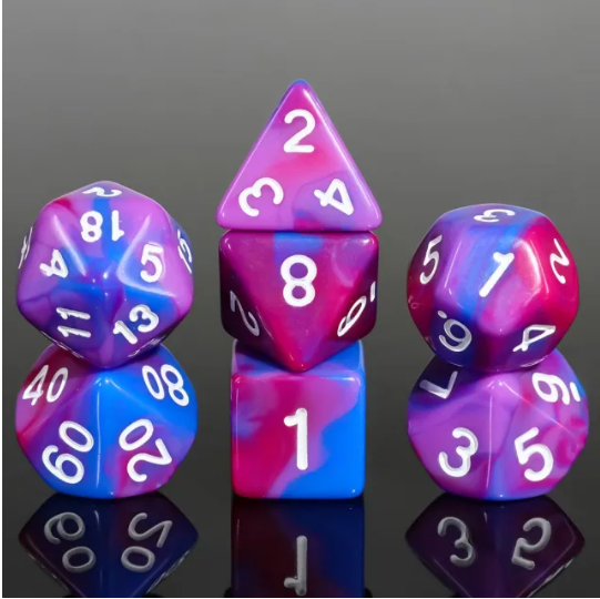 "Stars in a Can" - Purple Blue and Pink Swirl with White Inking - Polyhedral Dice (7) - Level One Dice