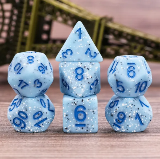 "Cool Mint Blast" - Light Blue with Blue Specs and White Inking - Polyhedral Dice (7) - Level One Dice