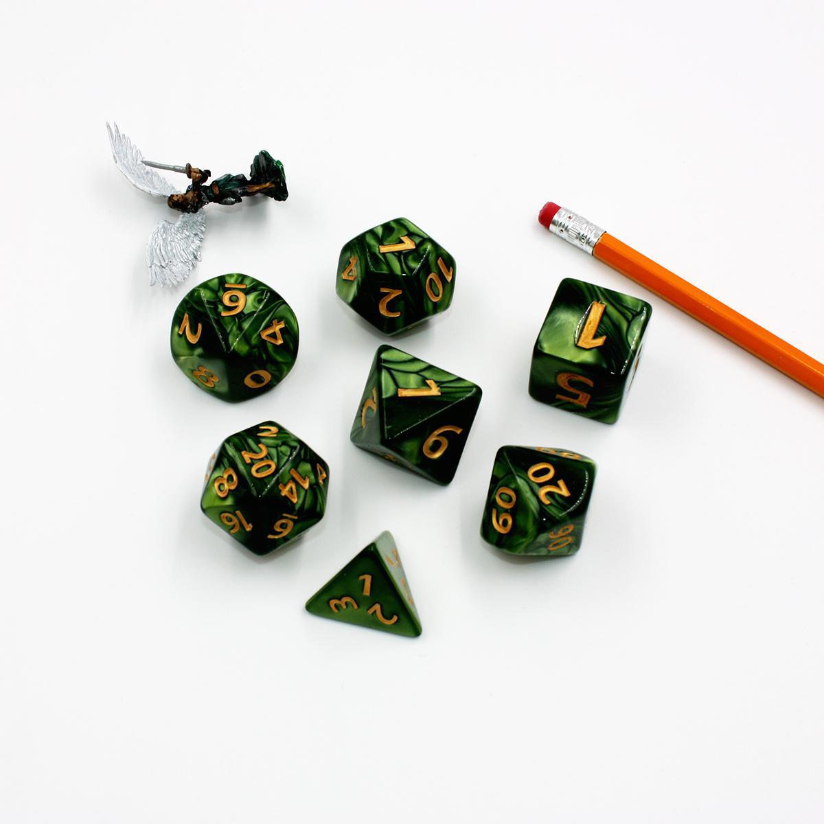 "Kiwi Fruit Blend" - Green and Black Swirl with Gold Inking - Polyhedral Dice (7) - Level One Dice