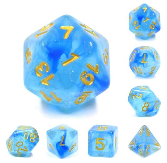 "Sorcery Snow" - Blue Swirl with Gold Inking - Polyhedral Dice (7) - Level One Dice
