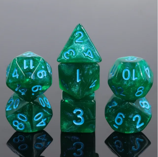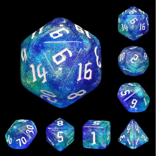 "Witch's Cauldron" - Blue and Green Galaxy Swirl with White Inking - Polyhedral Dice (7) - Level One Dice