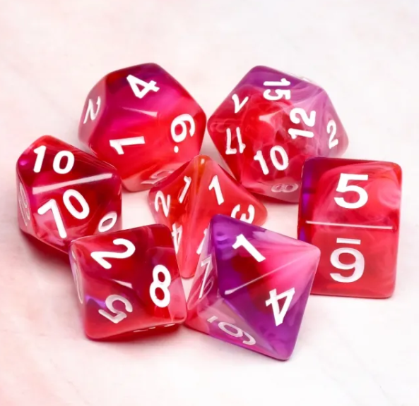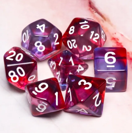 "Vampire Plums" - Red and Purple Translucent with White Inking - Polyhedral Dice (7) - Level One Dice