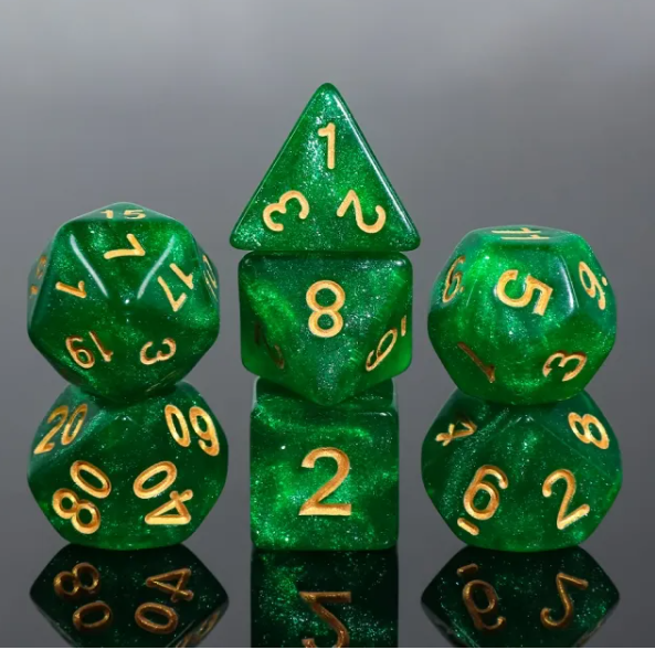 "Stamina Potion" - Green Glitter Swirl with Gold Inking - Polyhedral (7) - Level One Dice