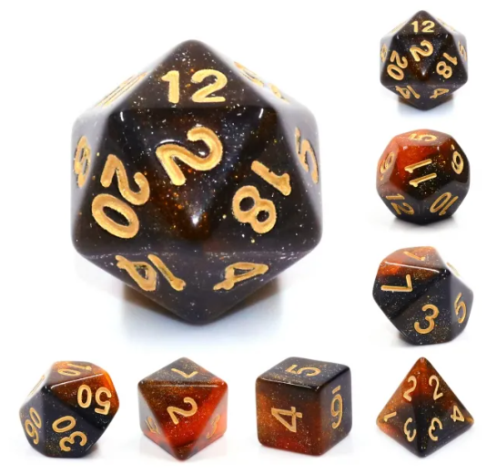"Black Cherry Cola" - Orange and Black Swirl with Gold Inking - Polyhedral Dice (7) - Level One Dice