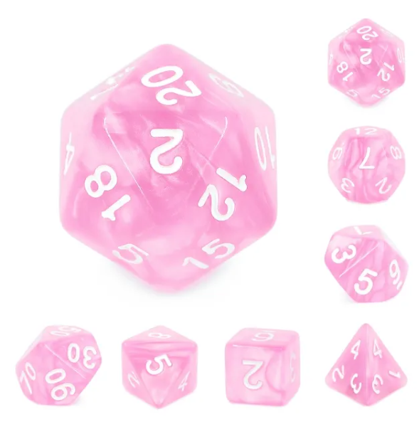 "Strawberry Creme" - Pink Pearlescent With White Inking - Polyhedral Dice (7) - Level One Dice