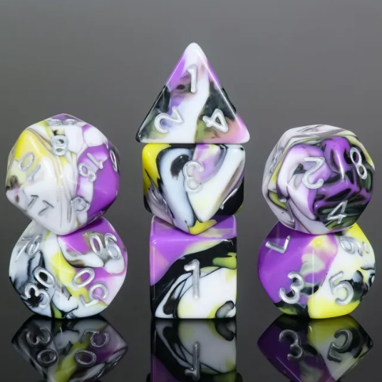 "Oil Berry" - Purple While Yellow and Black Swirl with White Inking - Polyhedral Dice (7) - Level One Dice