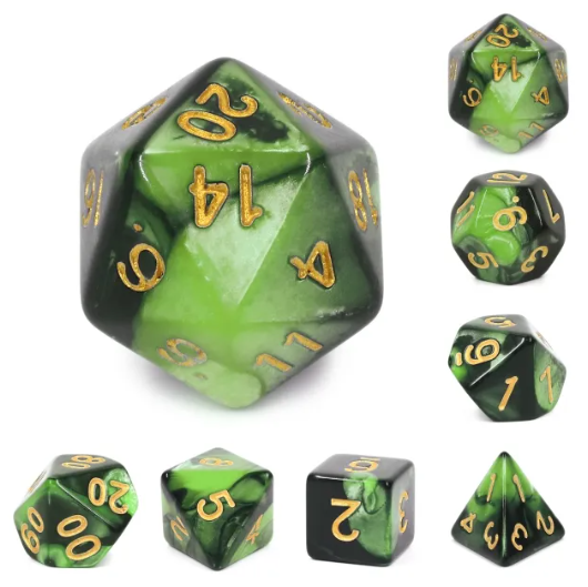 "Half 'n Half Berry" - Green and Black Swirl with Gold Inking - Polyhedral Dice (7) - Level One Dice