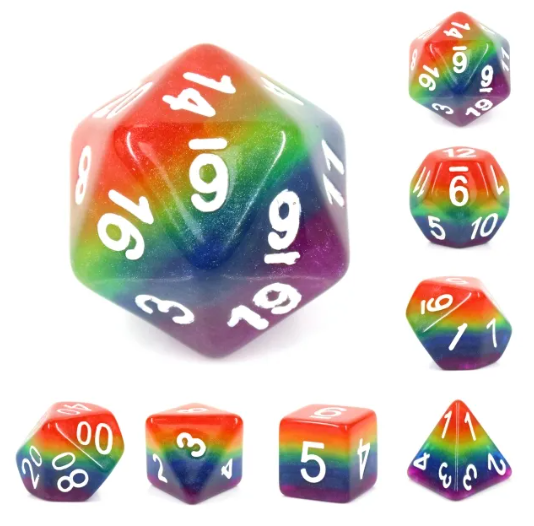 "Rainbow Crunches" - Rainbow Swirl with White Inking - Polyhedral Dice (7) - Level One Dice