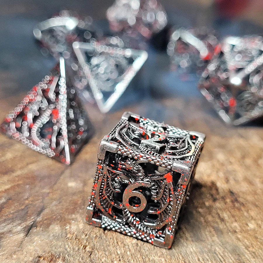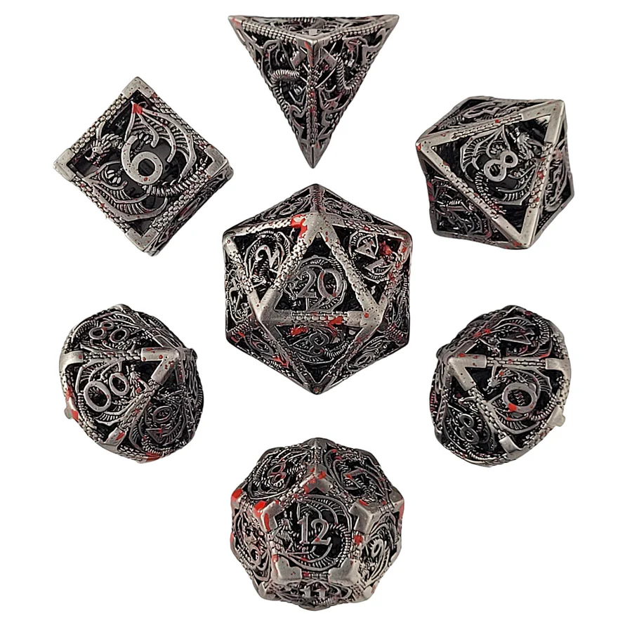 This set is HOLLOW. Each die features a rampant dragon in an iron silver finish, slight dark wash and blood splatter accents