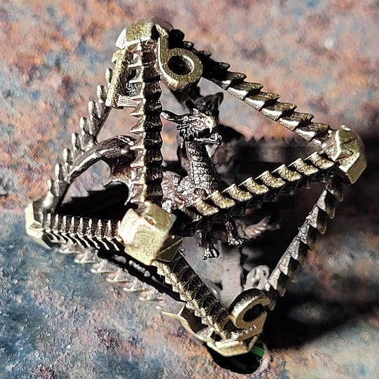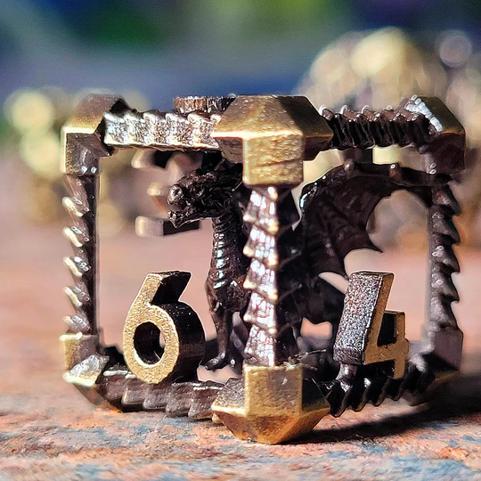 This hollow set has an antiqued gold finish featuring a captured dragon within each die.