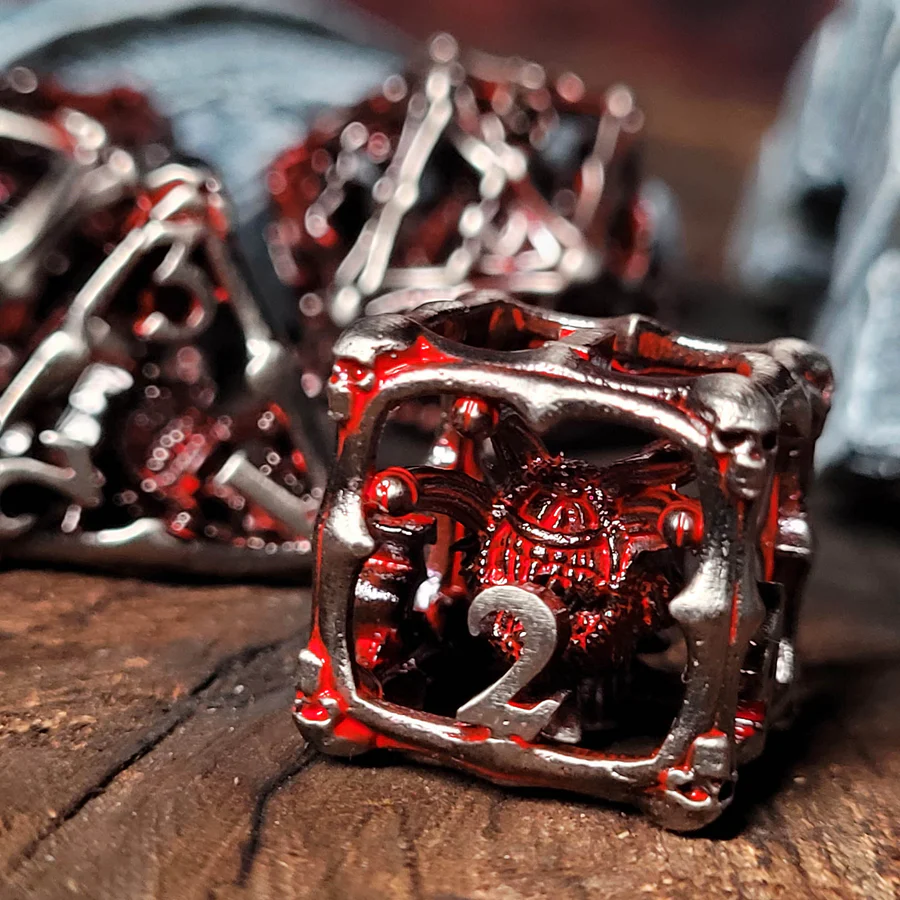 This set is HOLLOW. Each die features a Beholder imbedded inside, skull accents, in a nickel finish with a red wash.