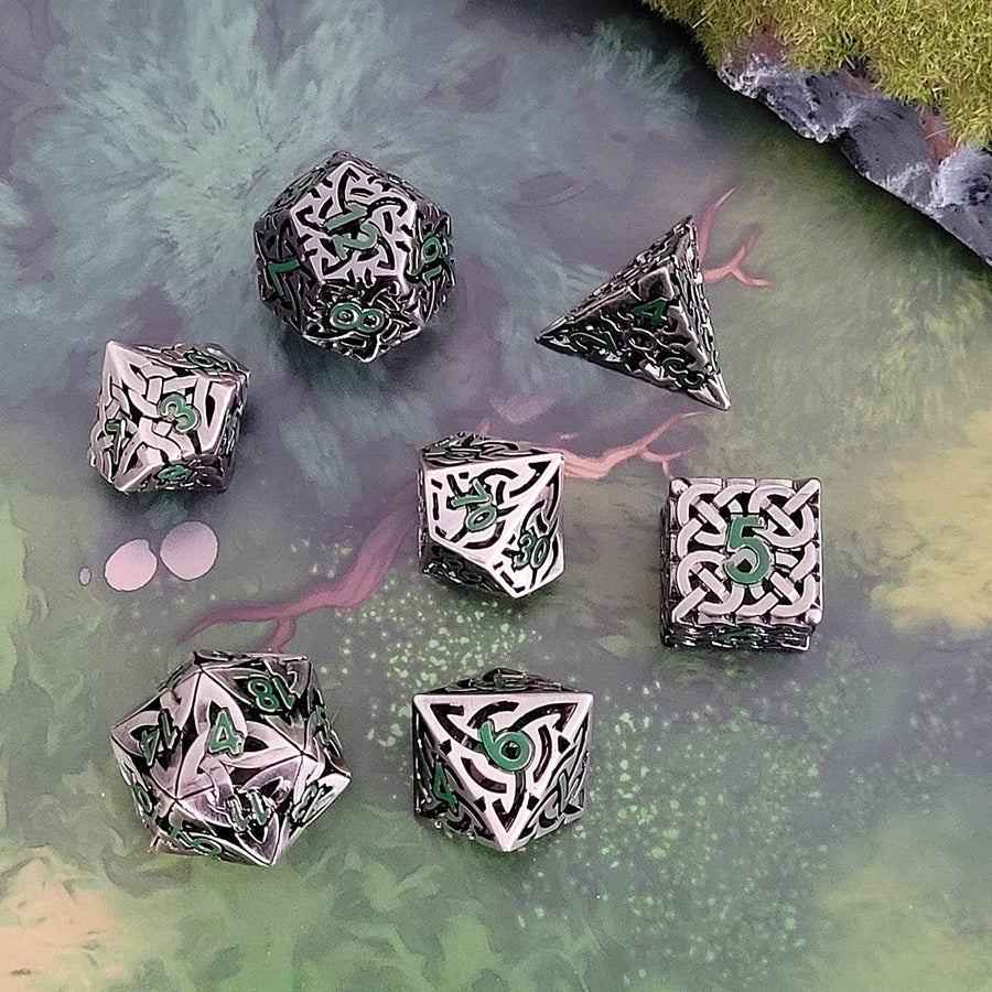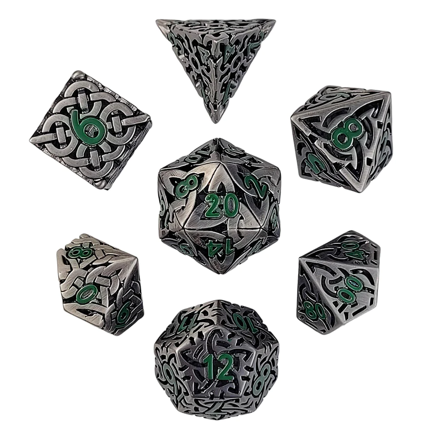 This set is HOLLOW. Each face features an intricate knot design in brushed silver with green numbers.