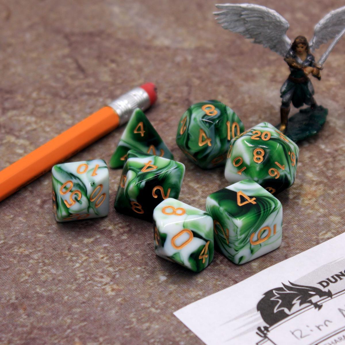 • "Matcha Latte" - Green and White with Gold Swirl - Polyhedral Dice (7) - Level One Dice