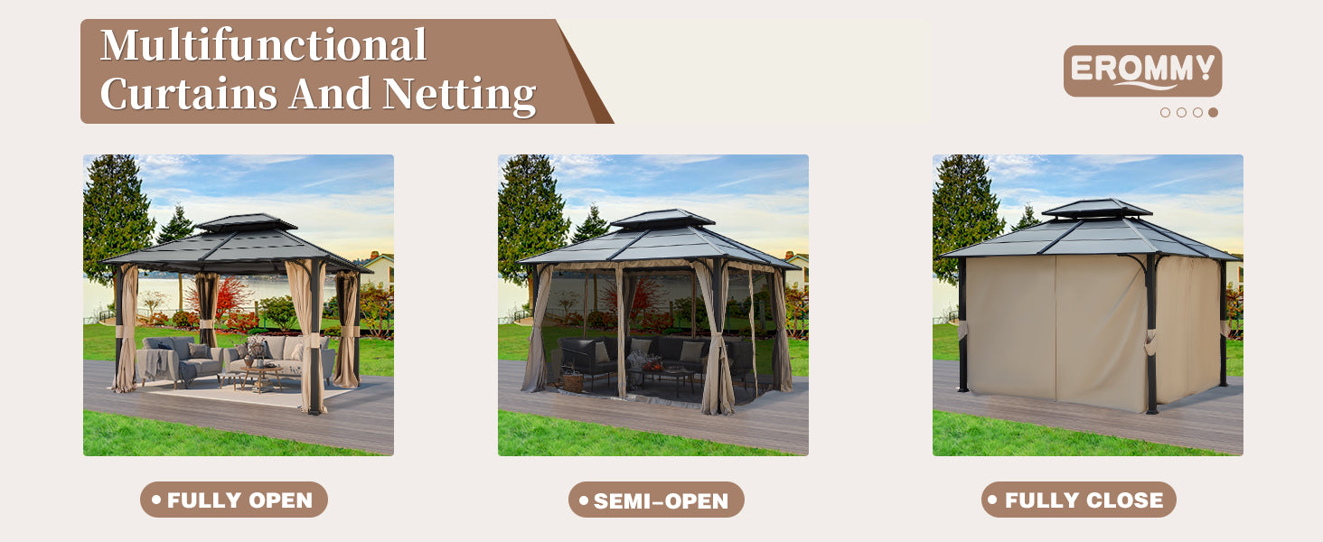 - 【Detachable Curtains&Netting】The all-weather gazebo itself contains a set of curtains and nettings. The double-track design allows double sidewalls and easy to slide each layer. Double-sided zipper privacy curtains and nettings protect you from insects, UV rays, and rain while maintaining adequate airflow and visibility.