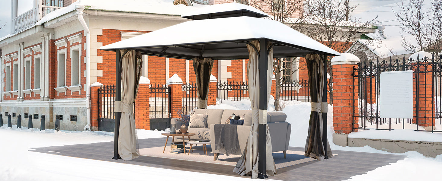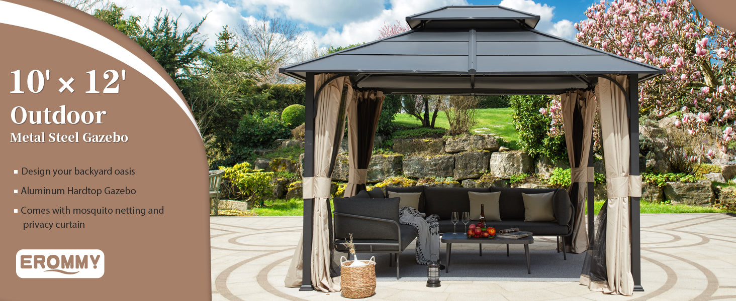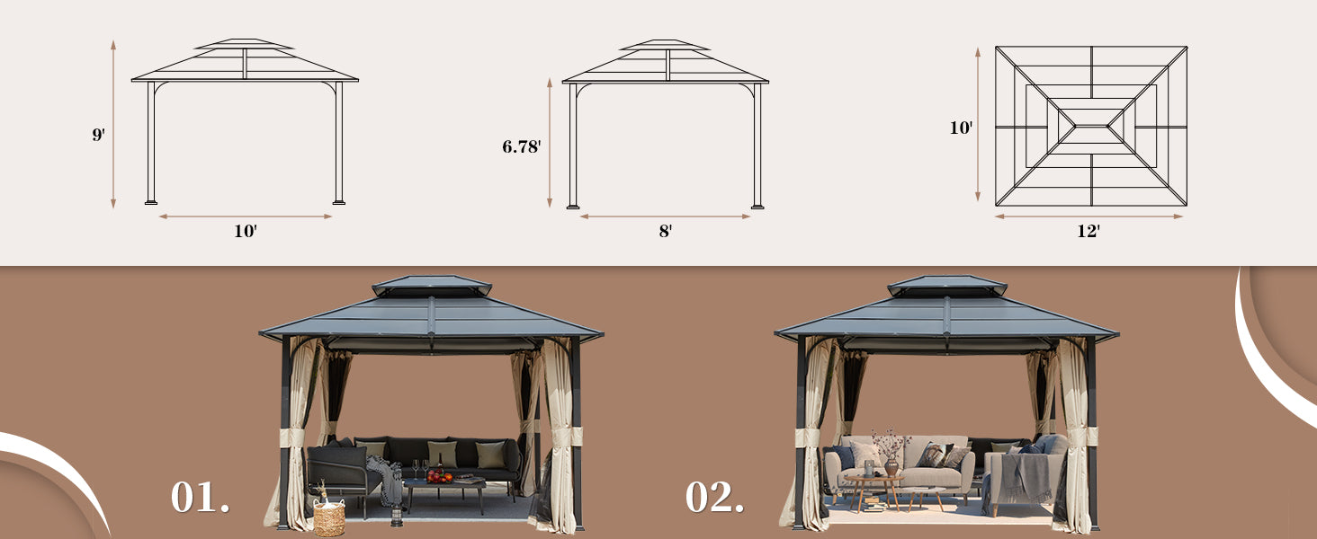 - 【All Metal Material】The iron roof and iron frame allow the 10×12 FT gazebo to be full of texture in design, making your metal gazebo look extra outstanding. Meanwhile, compared with other materials, iron materials can withstand stronger wind pressure and snow. Whether it's the scorching sun in summer or the continuous snow in winter, this gazebo can well protect you and your family and provide you with a safe and comfortable environment.
